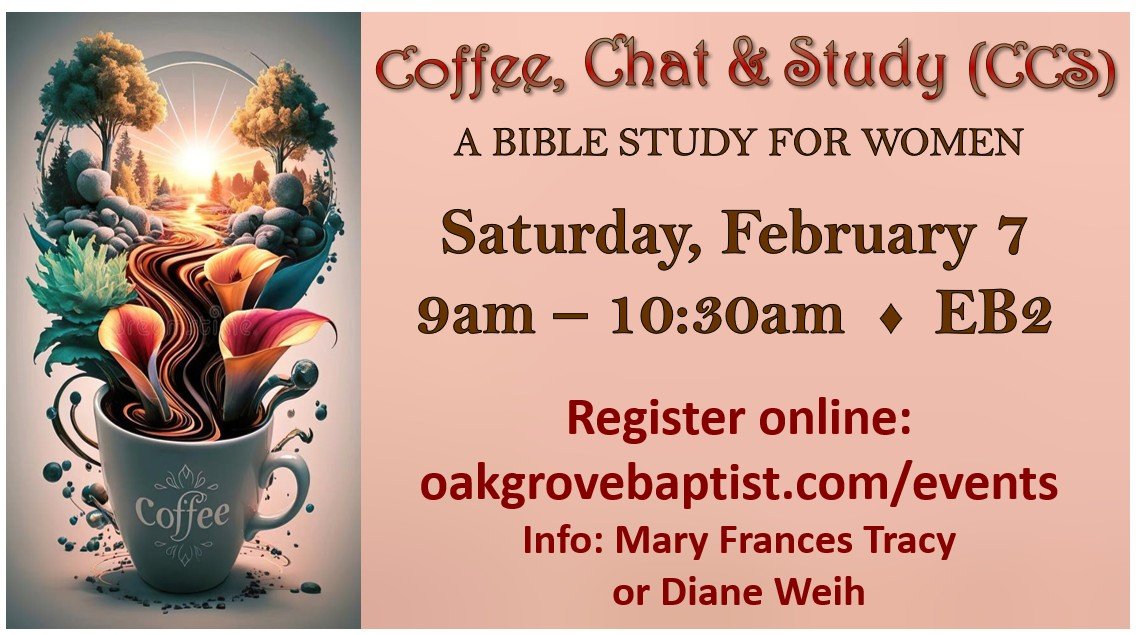 Feb 7 9:00 AM09:00 Women's Ministry Coffee, Chat & Study Saturday, February 7, 2026 9:00 AM 10:30 AM 09:00 10:30 Oak Grove Baptist Church (map) Google Calendar ICS register View Event →