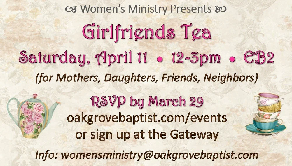 Apr 11 12:00 PM12:00 Women's Ministry Presents: Girlfriends Tea Saturday, April 11, 2026 12:00 PM 3:00 PM 12:00 15:00 Oak Grove Baptist Church (map) Google Calendar ICS Register View Event →