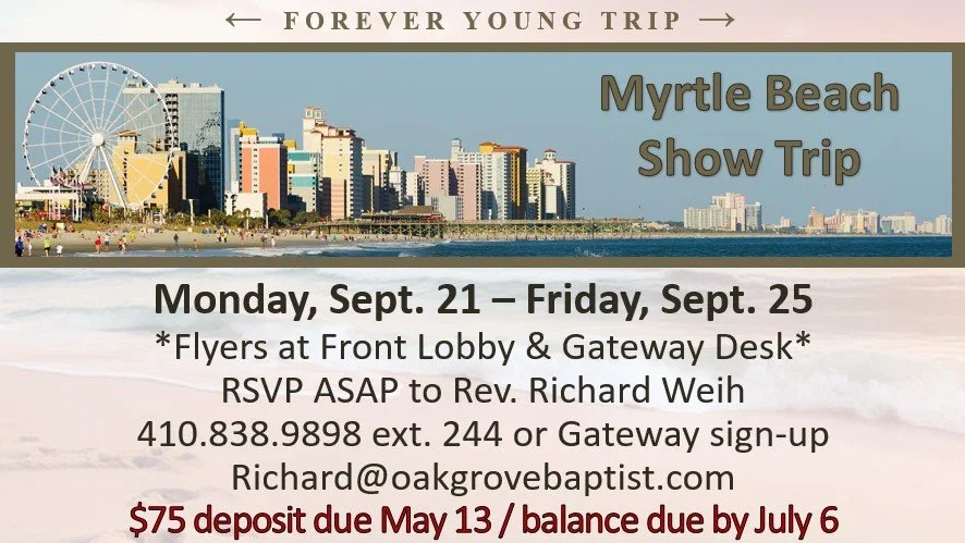 Forever Young Myrtle Beach Show Trip Monday, September 21, 2026 8:00 AM 08:00 Friday, September 25, 2026 5:00 PM 17:00 Oak Grove Baptist Church 2106 East Churchville Road Bel Air, MD, 21015 United States (map) Google Calendar ICS info via email