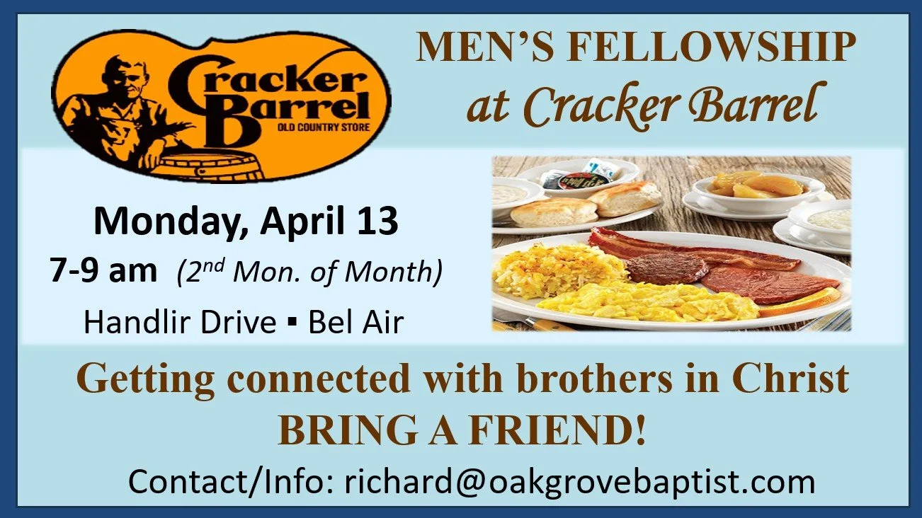 Men's Fellowship at Cracker Barrel Monday, April 13, 2026 7:00 AM 9:00 AM 07:00 09:00 Oak Grove Baptist Church 2106 East Churchville Road Bel Air, MD, 21015 United States (map) Google Calendar ICS info via email